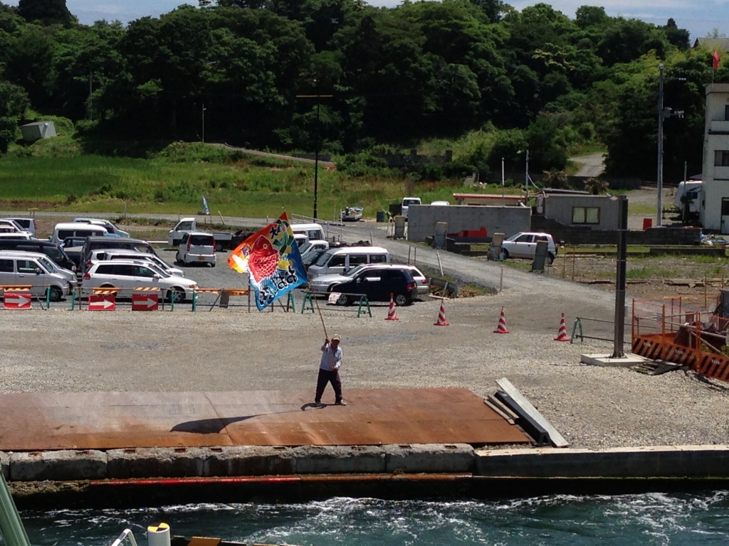 フェリーが見えなくなるまで、大きな大漁旗を振っていて、すばらしい光景でした。
