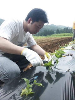 蒸し暑い中で、汗をかきながらの作業となりました。☆いよいよメーンの苗植え。大きくなるようにと願いながら、均等の間隔で丁寧に苗を植えました。