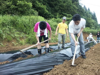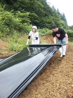 ☆畑は一画の長さが約20mあります。協力しながらマルチを被せていきます。