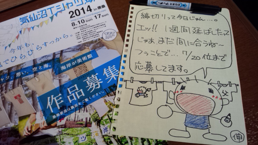…つぅことで、気仙沼Tシャツ海岸実行委員会では、約1ヶ月後に迫ったTシャツアート展のTシャツにプリントする「オリジナルデザイン」の募集期間を今月21日まで延長しております。