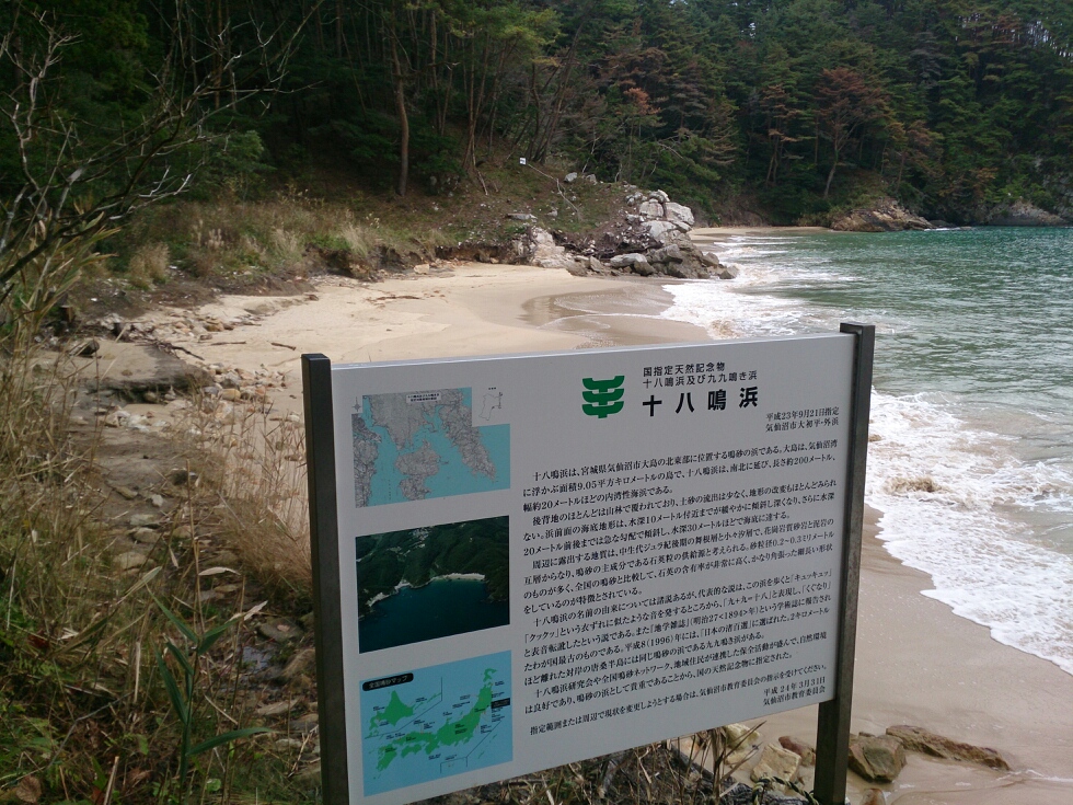 亀山から下る途中には、「キュッ、キュッ」と砂が鳴くことで、国指定天然記念物になっている「十八鳴浜」へ。自転車を降りること20分ほど、山道を歩くと、浜に到着。