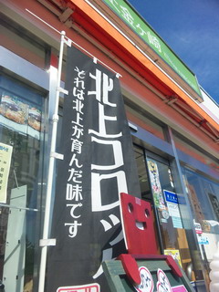 ☆北上コロッケののぼりを発見!今年4月の大川さくらまつり(http://kirakukai.blog.shinobi.jp/Entry/1790/)では売り切れてしまい、味わうことができなかったので、ずっと食べたいと思っていました。さっそくお店の中に入ると、、。どこかで聴いたことがある歌声とメロディーが店内に流れていました。