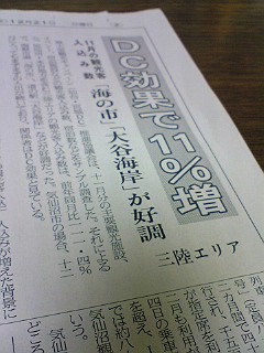 ☆今日の地元紙に、DC期間中の観光客入り込み数に関する記事が載ってました。それによると、気仙沼・本吉地方の11月の観光客数は前年より11%アップだそうです。気仙沼ではとくに海の市が好調で、関連して南気仙沼駅で下車する観光客も増えているようです。