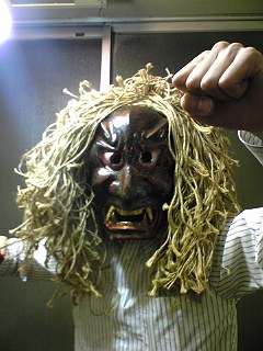 ☆今夜は鬼の面や衣装、装飾品の確認などのお手伝いをさせてもらいました。実際、鬼の面を拝見するのはこの日が初めてでしたが、予想してた以上の迫力にまずビックリ!。木を彫刻した精巧な造りといい、その表情といい、まさに本物の「鬼」です(←会ったことはないけど。。)。泣く子も黙る理由が分かります。。