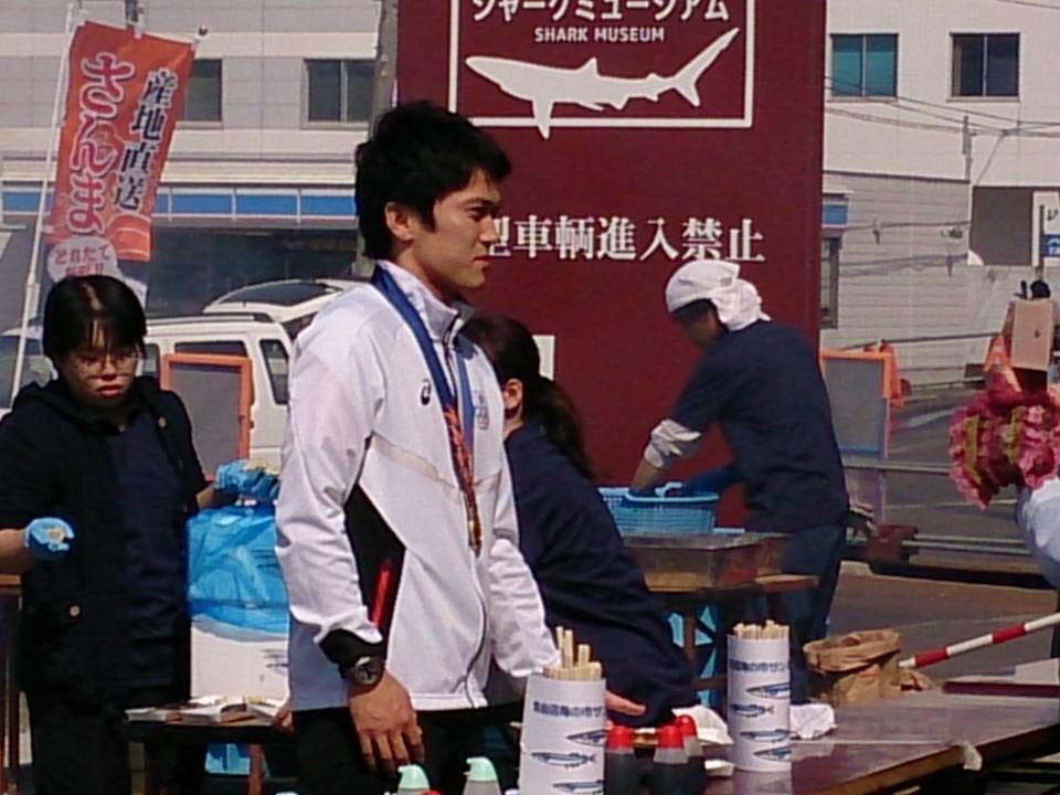 先のアジア大会に出場していた千田健太選手も駆けつけて、来場者にサンマを手渡し。首にひかるアジア大会の金メダルが、とってもまぶしかったです。