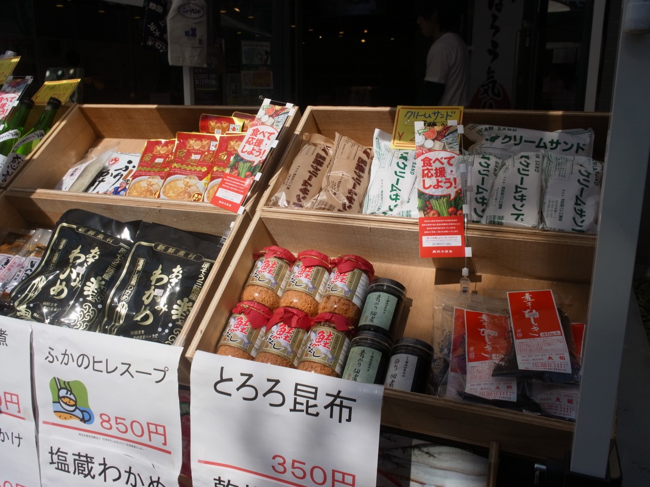 会場には、さんまのつくだ煮・ふかひれスープ・わかめ・クリームサンドといったおなじみの商品がならんでいました。