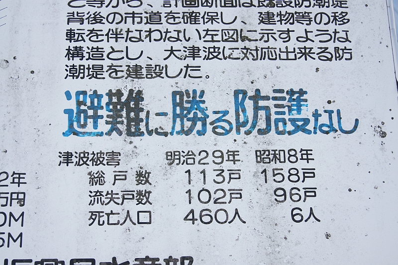 田老地区の被害は、堤防が決壊したのではなく、堤防があることで過信とともに、海が見えず津波が来ていることに気づくのが遅れたことも一因にあると言われています。