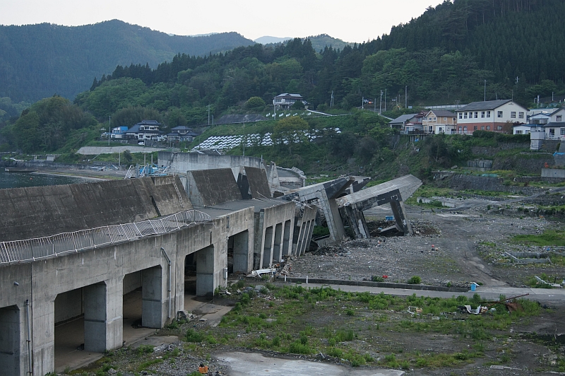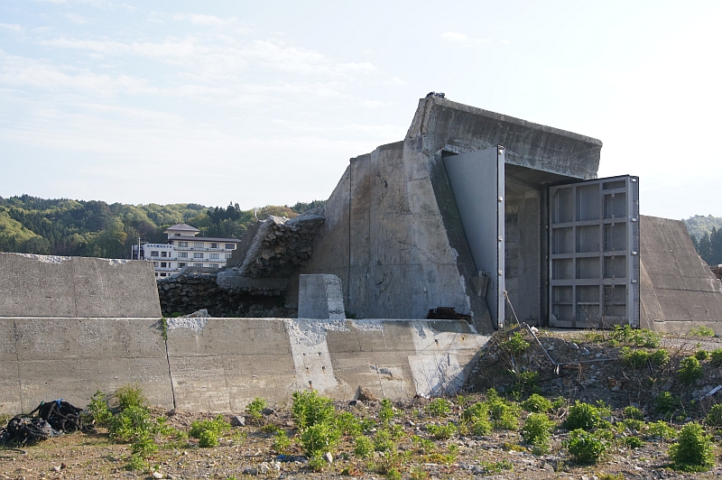 よく田老の防潮堤は津波によって破壊されたと言われたりしてますが、実際には古くからある田老堤防は決壊することなく堅固に佇んでいました。しかし、新しく海岸沿いに築かれた堤防は、水門だけが残る無残な姿へと変わっていました。