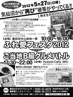 かずきです。明日は愛知県で開催される気仙沼復興応援イベント「ふれ愛フェスタ」に参加するため、豊田市に行くことになりました。昨年10月に現地で講演させていただいたご縁で、向こうの20代~30代の若手まちづくりメンバーとも意気投合。豊田の皆さんも昨年末、気楽会の忘年会にも参加してくれたほか、「3.11ヒカリプロジェクト」にもご協賛いただくなど、気仙沼を応援してくれています。