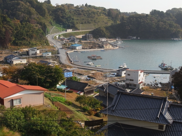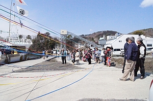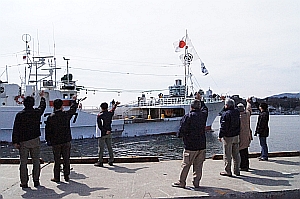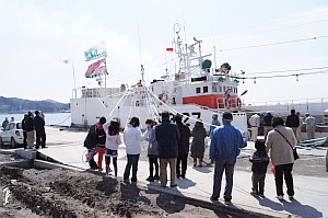 チーム九州の宿・大鍋屋さんから鹿折駅前の共徳丸に向かって走り出すと、コの字岸壁で「出船」を発見。