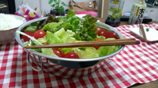 第一段として、早速夕飯前に銀ボールに一杯の野菜を食べてます。