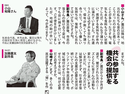 『市民との「絆」からまちの「絆」へ~キズナを繋ぐ~』と題して、加藤副市長を囲んで震災直後から支援活動しているボランティの方々との対談が掲載されています。