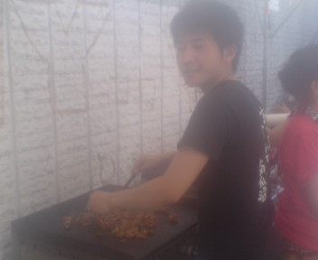 鉄板を前にして、両手にヘラを持ち、ただひたすら目の前にあるホルモンをかき混ぜる。