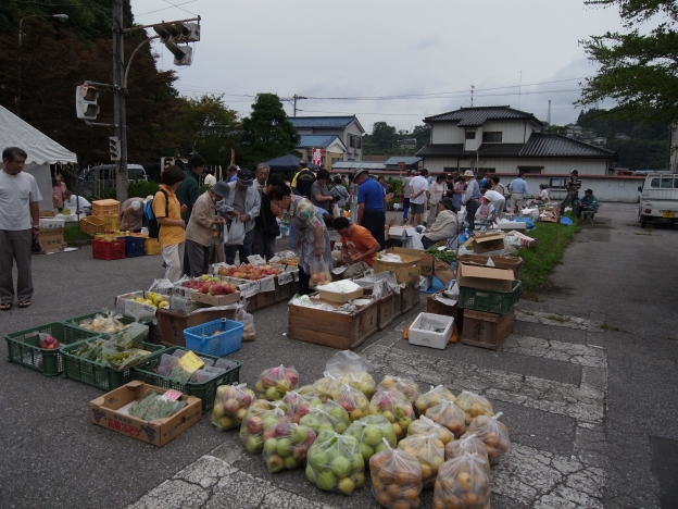 りんごや野菜・お花・がんづき・鮮魚・乾物・お米など、旬のものや日常品がたくさんならんでいて、私もナスとトウモロコシを購入しました。探していたお店は残念ながら出店されていませんでしたが、朝市のような顔が見える買い物は、たのしみがあります*