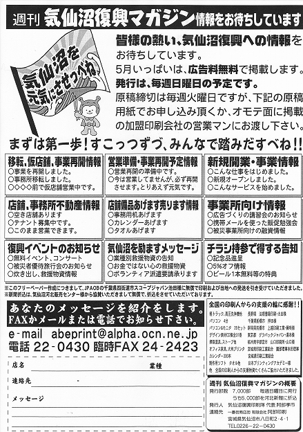 5月8日発行分は創刊準備号ということで、被災により移転再開したお店の情報などが載っています!!