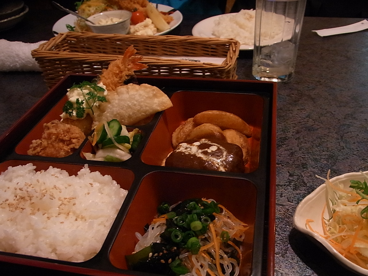 ハンバーグ・エビフライ・唐揚げ・海藻サラダ・卵スープなど、一品一品がとてもおいしく大満足の内容です。