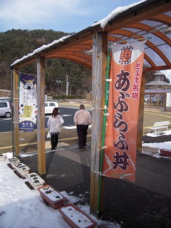 ☆ファーストフードや地元のご当地グルメを味わうことができるお店も併設されているので、週末になると大勢の観光客で賑わうそうです。ちなみに、写真の方はご案内いただいた「林林館」の熊谷駅長さん。寒い中、親切に道の駅内を案内していただきました。
