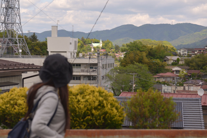 向こうに見える教会風な建物。
