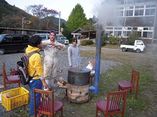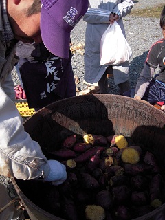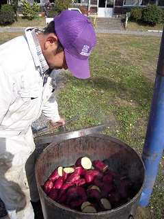 手作りの焼き芋機で、収穫したばかりのサツマイモを焼き芋にすることに!