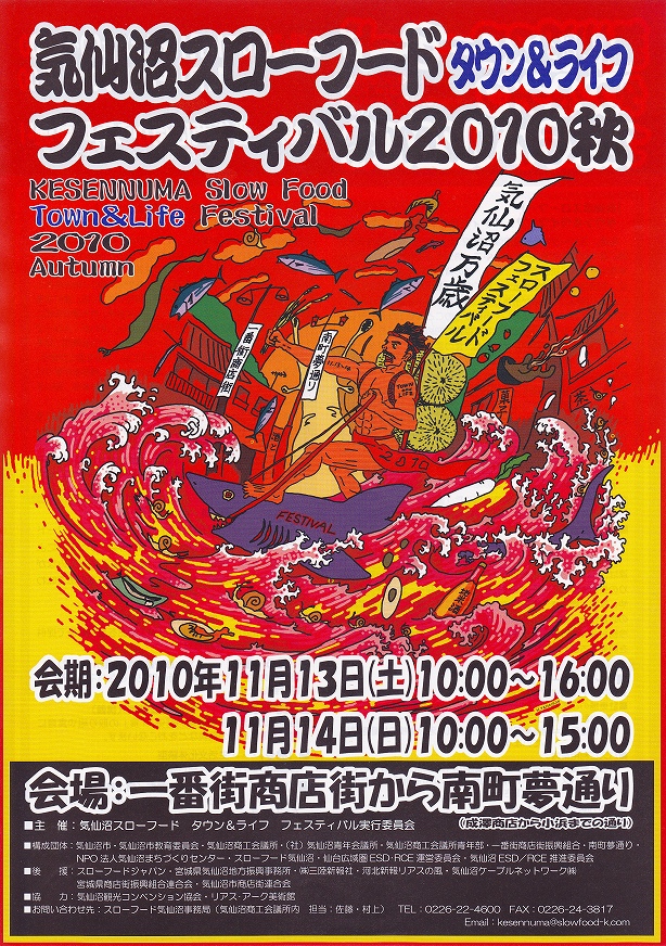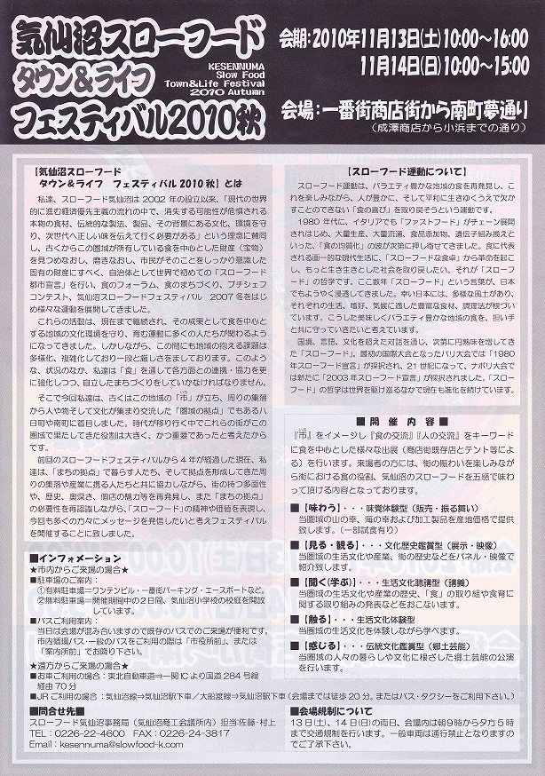 先日の原田さんの記事にもありましたが、来週の土日に「気仙沼スローフードフェスティバル2010秋」が開催されます。気楽会としては参加しませんが、気仙沼をアピールするとても楽しそうなイベントですので、勝手に宣伝いたします~