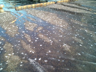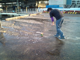 七輪広場の会場は、昨年と同じ場所で開催していましたが、実は、昨年のアンケートで、会場がカモメのフンで汚いというご指摘があり、今年は、前日にスタッフみんなでデッキブラシを使って綺麗に掃除をしました!