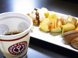 夕暮れの素晴らしい雰囲気の下、美味しいコーヒー・ドーナツ・クロワッサンなど
