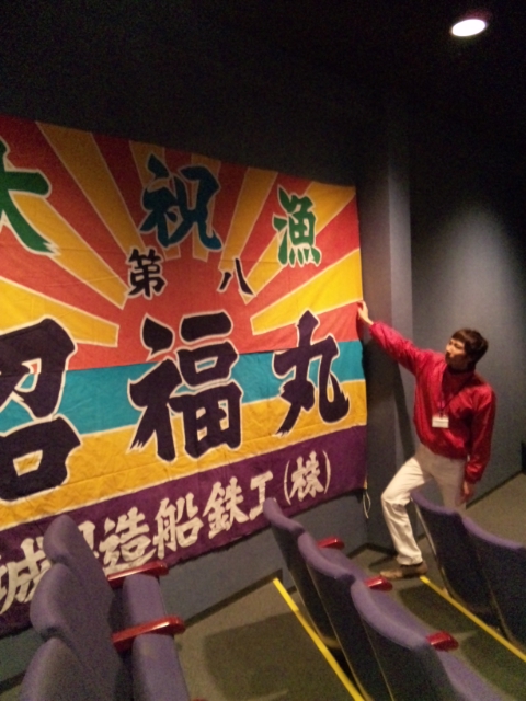 最大70人ぐらいは収容できるそうで、日常的に市民有志の皆さんが映画の上映などに利用しているみたいです。先日、試験的に映像を流していただいたんですが、これがすごいド迫力!マグロと格闘する洋上の様子、迫力の波しぶきなどが大画面と大音量で鑑賞することができます!本当、リアルに洋上にいるような気分を体感できると思いますっ!