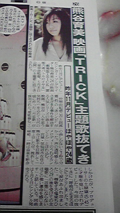 ところで、話しは変わるんですが、先週、スポーツ報知を見ていたら、以前カタリバーのゲストに来てくれた熊谷育美さんが、5月8日公開の映画「TRICK」の主題歌に抜てきされた、という記事が載っていました!!