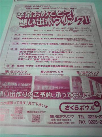 さくらボウルでは今年に入って何かしらイベントを続けていますが来月は卒業おめでとう!想い出ボウリング!!と題した卒業生を対象としたイベントを行います。これは今月初めに新聞の折り込みチラシでも目にした方はいるかもしれませんが、2ゲーム貸し靴代込みで破格の500円。申込みは卒業生1クラス単位。開催期間は3月初めから26日までの平日夕方スタートになっています。