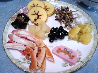 蟹、かまぼこ、黒豆、数の子、佃煮、昆布といった品々を