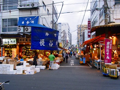 写真は築地玄関口の場外市場で、非常に活気があります。