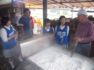 ☆今週の観光案内課に参加してくれた気仙沼女子高の生徒さん3名も一緒に体験しました!塩づくり名人・遠藤伊勢治郎さんから、塩づくりの基礎を学びました。