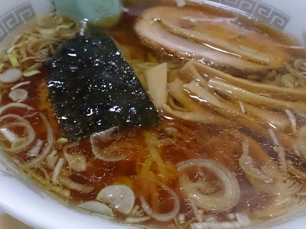 ラーメンは、チャーシューとメンマと黒々とした海苔が乗ったオーソドックスな細麺の醤油ラーメン。これぞ「日本の中華そば!」。