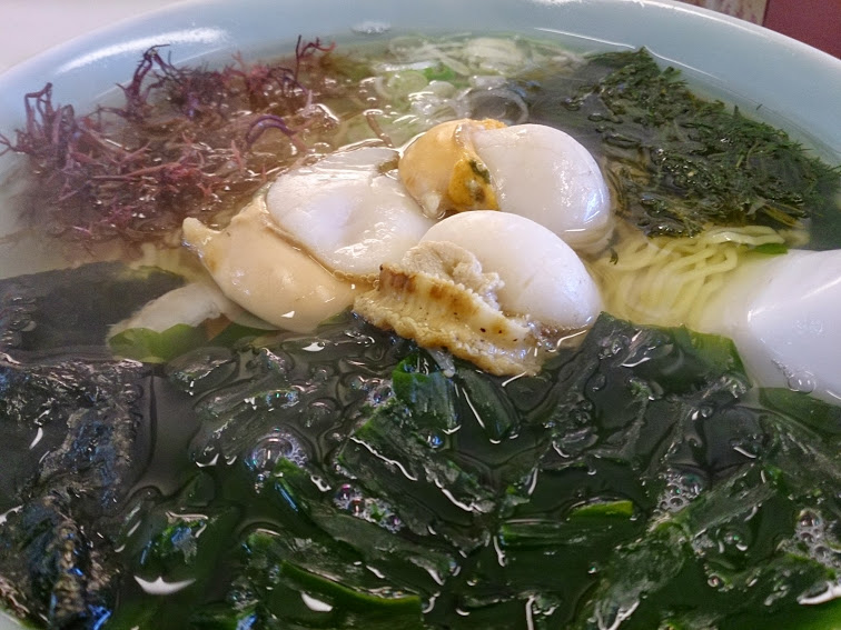「わかめ」と「ふのり」と「まつも」と海藻類がびっしりと敷き詰められたうえに、プリプリのホタテが鎮座して、600円。手頃な値段ながら、ダシがしっかりと効いた透明なスープとの相性も抜群で、今回も大満足でした。また食べたくなってきた。