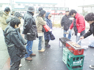 雪の中、凍えながら気仙沼ホルモンを焼く