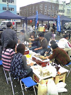 ☆残念ながら人気の「ジャンボのり鉄火巻き大会」には参加できませんでしたが、炭火焼きコーナー「七輪広場」には行くことができました。会場で買った魚介類などを持ち込み、その場で炭火焼きにできるということで、これまたたくさんの人で賑わってました。