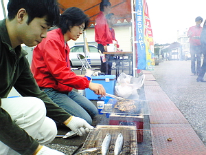 気仙沼ホルモンとサンマを焼いて振舞いました