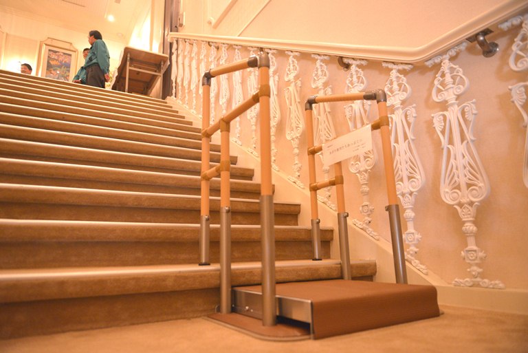 会場の階段には福祉用具のサンプルが置かれてみたり、