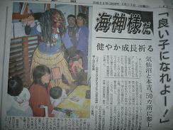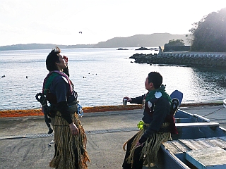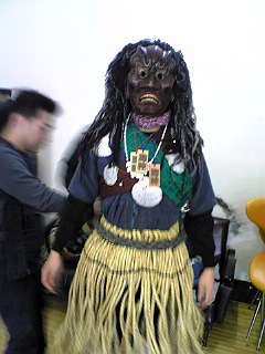 今回も参加してみてとても良かったです。前回も言ったと思いますけど、魂入れの儀式を行うと、自分が本当に海神になって子供たちをいい子にさせなきゃというような使命感が出てきます。移動中はゼェゼェいってますが、いざ子供たちを前にすると疲れとかいっさい無くなって海神パワー炸裂。しかも海神様をやると子供達やお年寄りの方々から逆にいろいろなことを学ぶことができるし、自分自身も海神様に相応しい人間になろうという気持ちになれます。さらに終わったあとは言葉ではいい表せない充実感と感動が溢れます。今回は自分なりにけっこう反省点もあるけれど、本当にとても良い経験になりました。これも代表の小山さんをはじめ甚六鬼の会の先輩方、そして訪問に協力していただいた各家庭・施設の皆さんのお力があってこそだと思います。本当にありがとうございました。また来年が楽しみです。みなさんも是非参加してみてはいかがでしょうか?