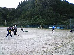 会場となる唐桑運動場でグラウンド整備&練習をしました