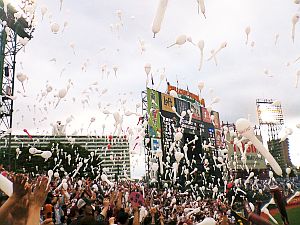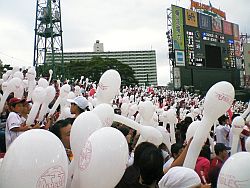 スタンドは勝利の白風船でいっぱい!