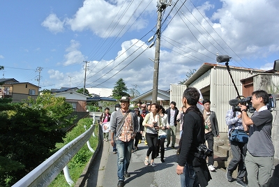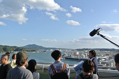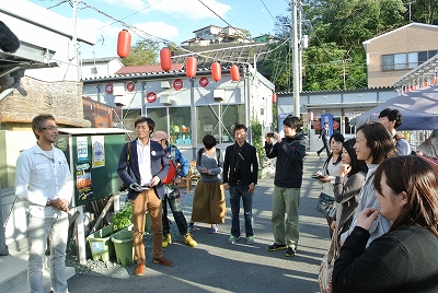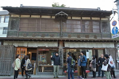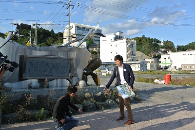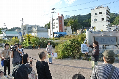 魚町をバックに、屋号通りや風待ち研究会のお話をしつつ、