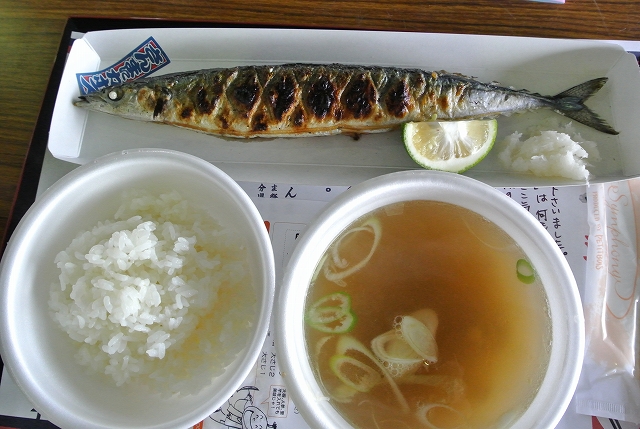 (内容はサンマの塩焼き、サンマのすり身汁、熱々ご飯)