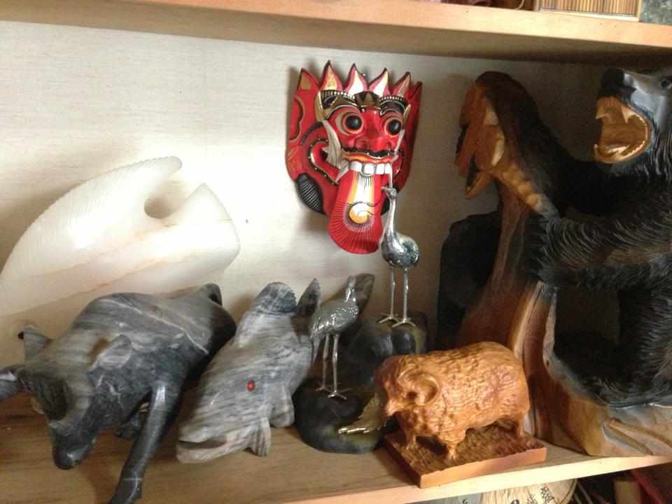 ラテン系帽子や西洋人形、木や石でできた置き物、動物の角や剥製など、
