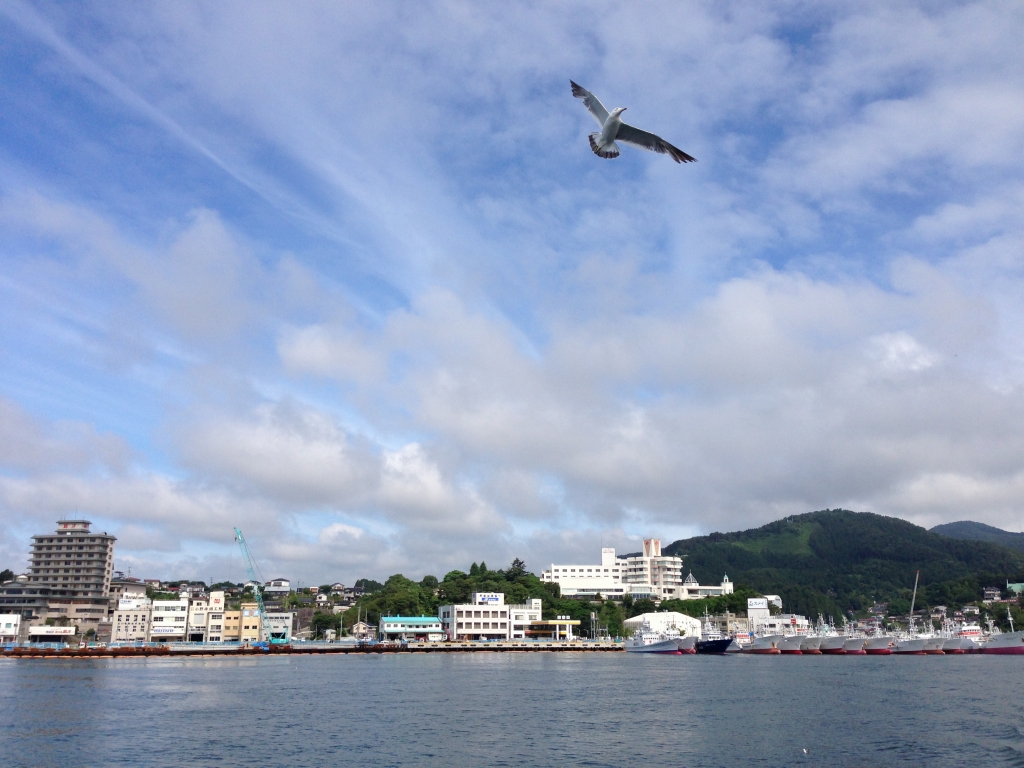 フェリーが見えなくなるまで、大きな大漁旗を振っていて、すばらしい光景でした。