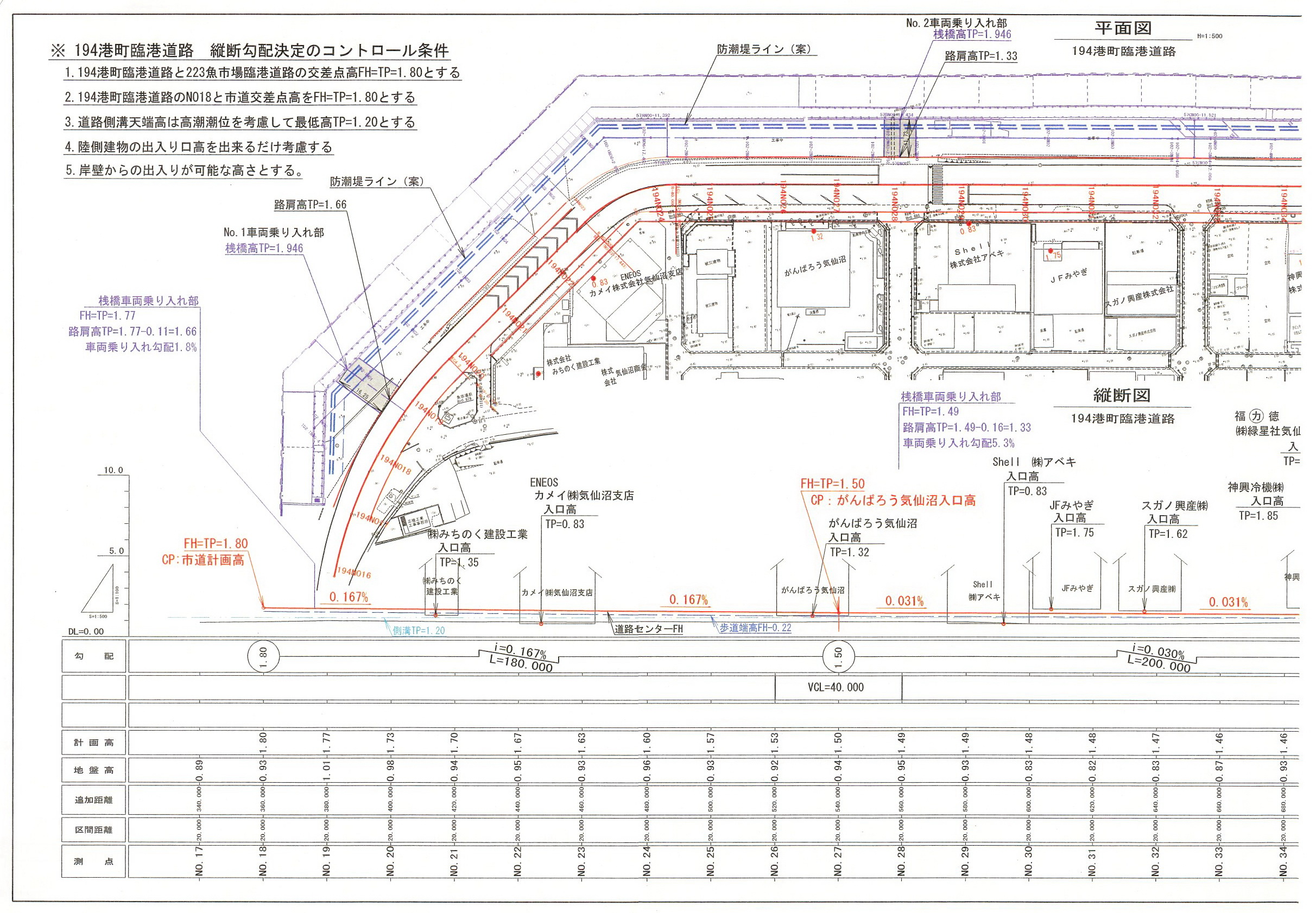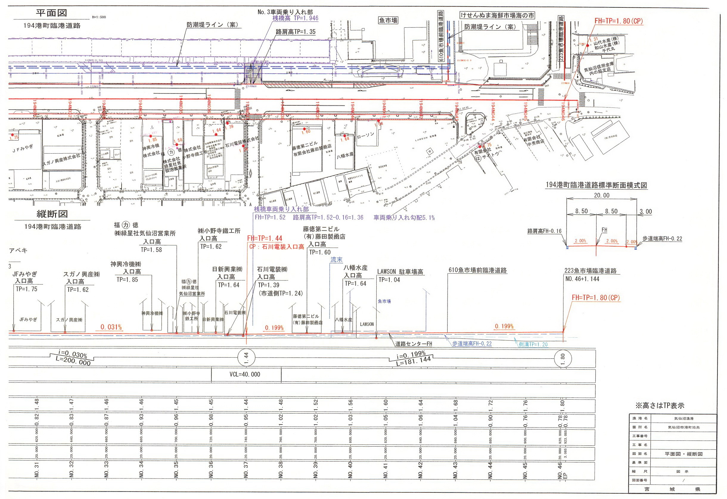 上記地点の道路中央部分を基本TP1.80mでの嵩上げ予定とし、