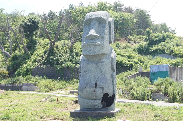 その前の入口にモアイ像のハリボテを発見。
