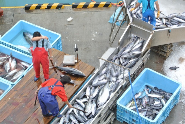 買い付けたカツオを箱詰めして発送準備している様子、