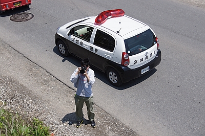 カメラを構えている道有くんの脇で、パトカーが信号待ちしてました。