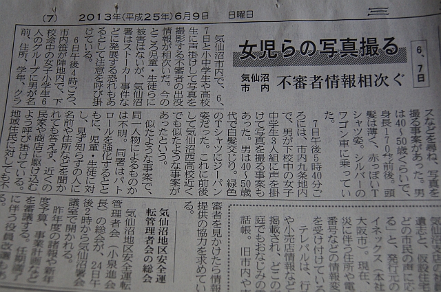 で、案内課が終わって三陸新報を読んでいたら、「不審者情報相次ぐ」の記事が……